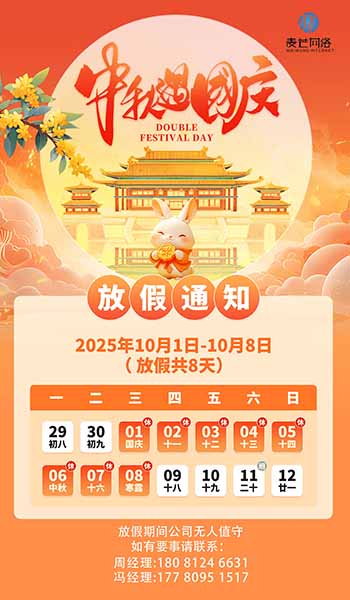 請各位客戶提前做好各項工作安排,為您帶來的不便,敬請諒解!放假期間,如有要事:請聯(lián)系: 18081246631 周經(jīng)理 17780951517 馮經(jīng)理